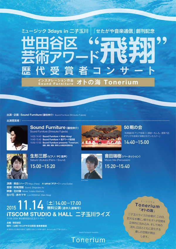 「世田谷区芸術アワード“飛翔”」音楽部門の歴代受賞者参加による公演。第2回受賞の藤枝伸介氏による空間インスタレーション作品「Tonerium」の中で各受賞者が生演奏を披露します。