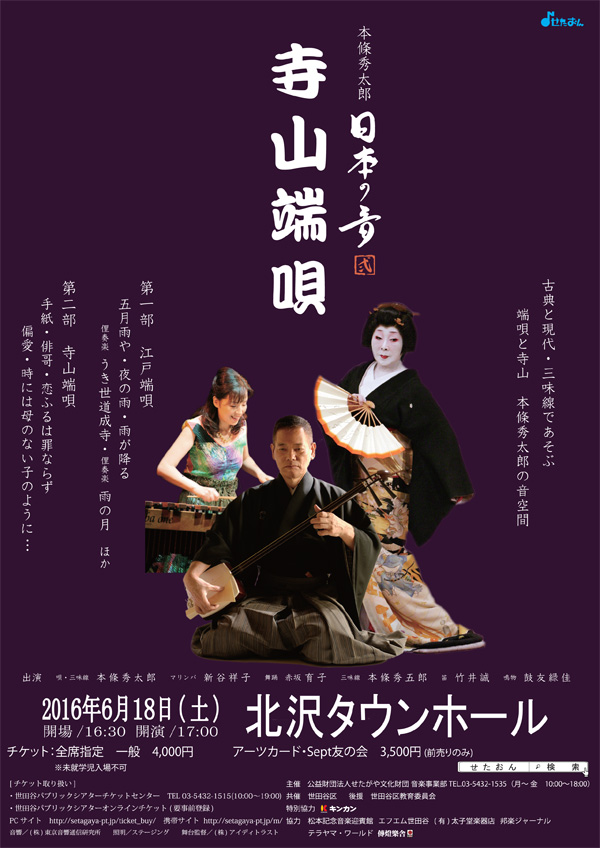 昨年、浮世絵を題材に酒脱な演奏とトークでお客様を魅了した三味線奏者の第一人者、本條秀太郎の「日本の音」。